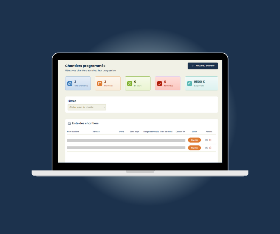 Visualisez clairement vos chantiers BTP en cours ou à venir, assignez vos équipes et gardez une vision claire de l’avancement et de la charge de travail.
